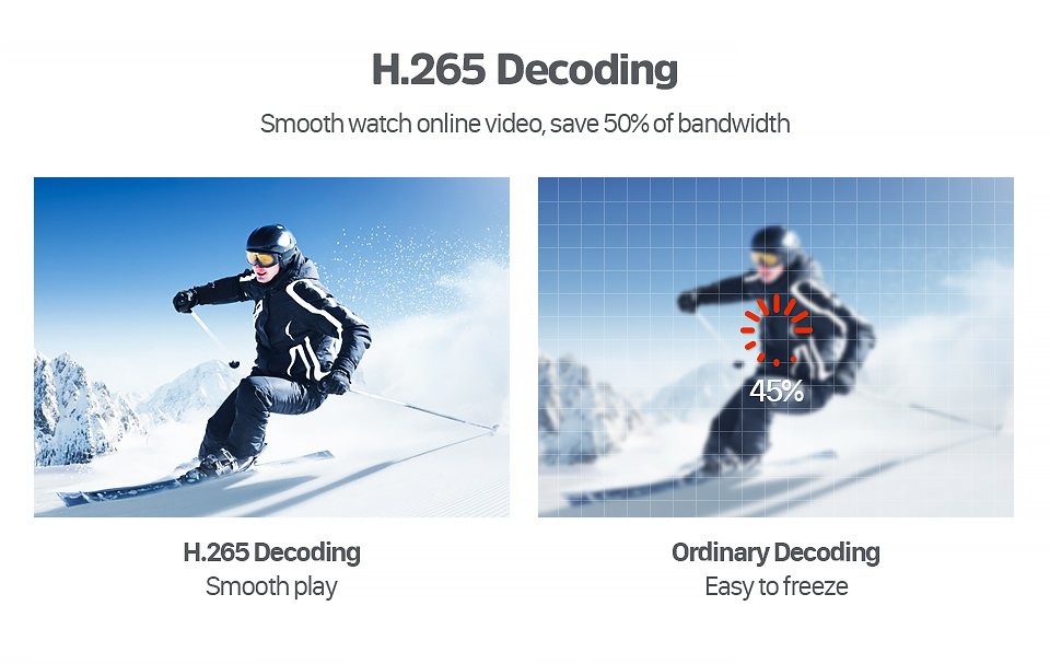 – Support H.265 video code, enjoy high resolution video even in low internet speed environment.