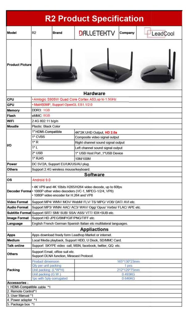 - ?【2GB RAM and 16GB ROM】R2 TV box provides 2GB DDR3 RAM 16GB ROM CPU bring quick start for your apps and games. You can download many apps as you want via this android tv box. It supports extra micro SD card to get more rooms.